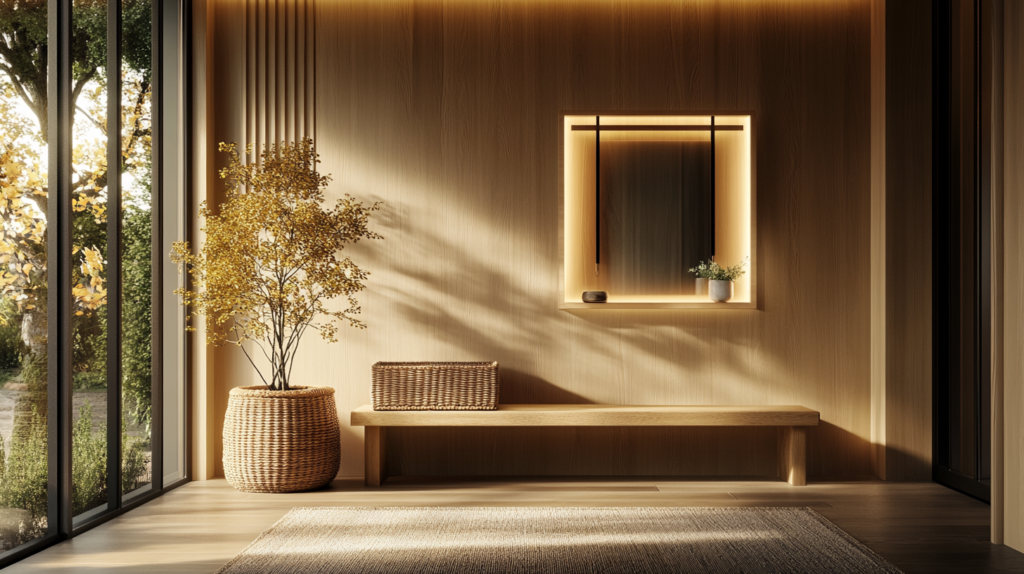 Make a great first impression with a Japandi-inspired entryway. A wooden bench paired with a woven basket for storage creates functionality and style. Add a neutral-toned rug and a small hanging mirror framed in light wood for a welcoming touch.