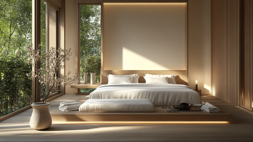For a restful night’s sleep, embrace Japandi style in your bedroom. Choose a low platform bed with white linen sheets and a light wood headboard. Decorate with shoji screen partitions and a ceramic vase filled with dried flowers. Keep it minimal to maintain a calming atmosphere.