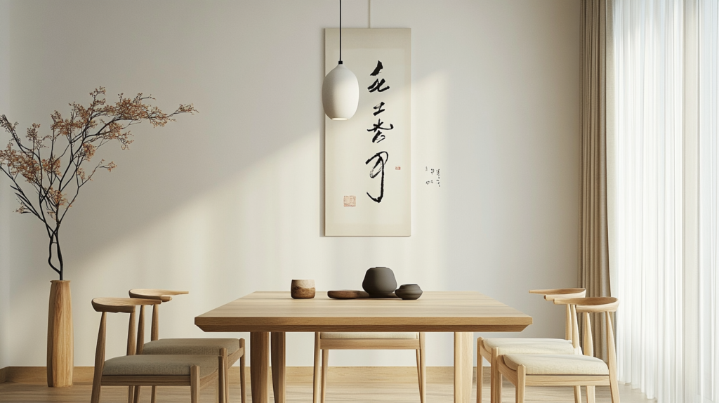 Create an inviting dining space with a natural wood dining table and Scandinavian-style chairs. Keep the decor simple with pendant lighting and white walls. A single piece of Japanese calligraphy art can serve as the perfect focal point.