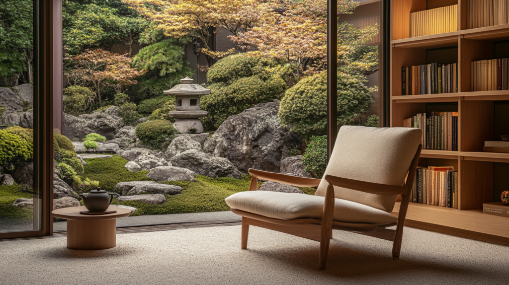 Carve out a quiet reading corner with a low wooden chair, a soft cream cushion, and a small side table. Add neutral-toned bookshelves and soft lighting to enhance the atmosphere. If possible, position the nook near a large window overlooking a Japanese rock garden.