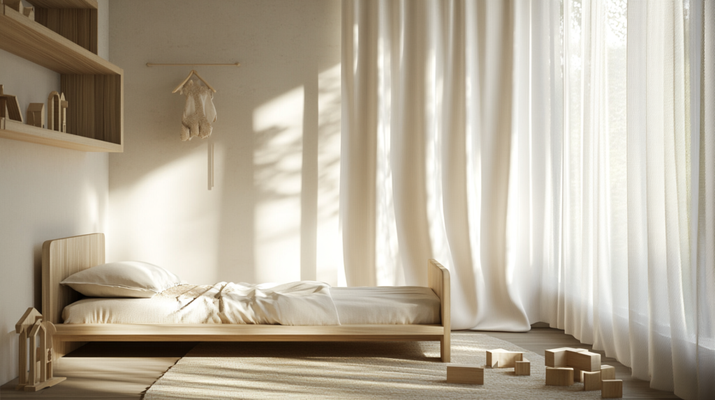 Japandi is perfect for kids’ rooms, promoting calm and organization. Use a small wooden bed with soft beige and white bedding. Keep light wooden toys neatly arranged on minimalist shelves and use sheer curtains to create a softly lit environment.