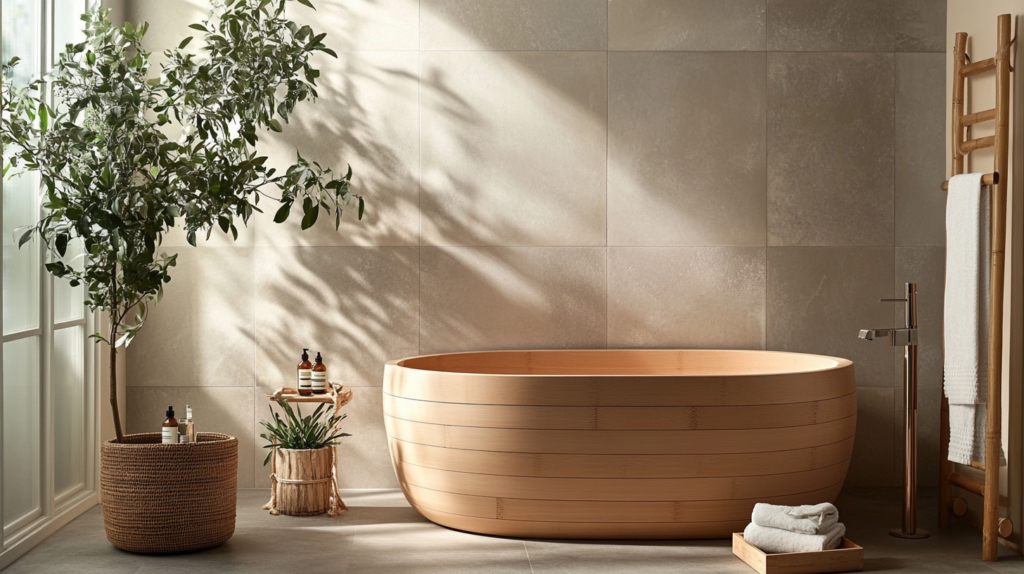 Bring spa-like tranquility into your bathroom. Install a deep wooden soaking tub with light gray stone tiles for a luxurious feel. Combine a rainfall shower with soft natural light and bamboo towels. Add a small potted plant to complete the serene ambiance.