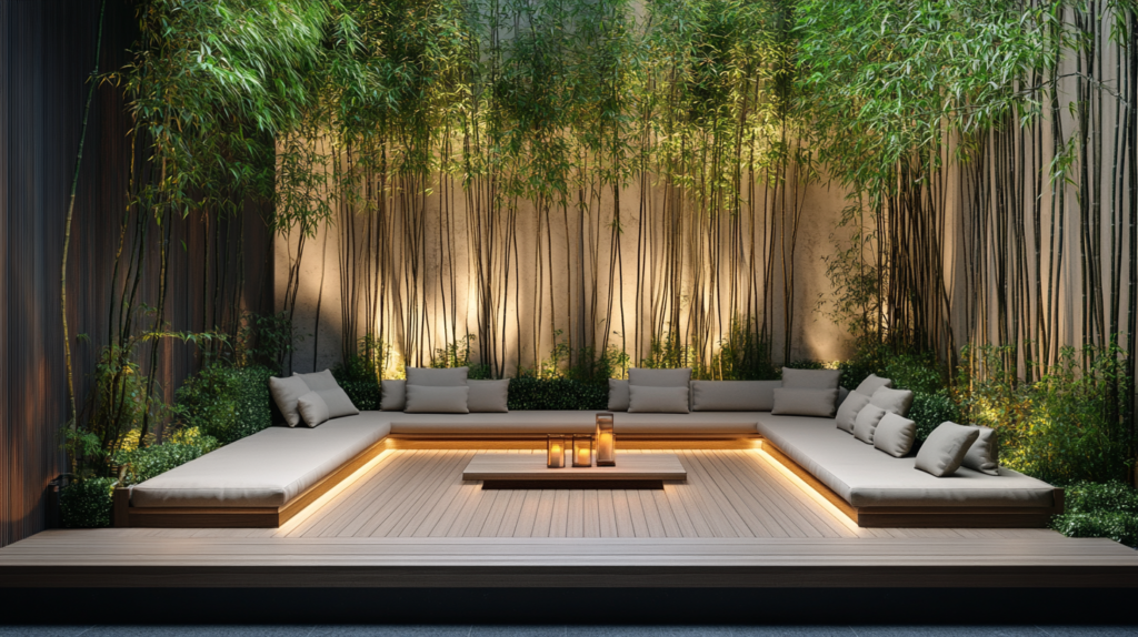 Bring Japandi style outdoors with a wooden deck, minimalist seating, and neutral cushions. Add a low wooden table and surround the space with bamboo plants. Lantern lighting will enhance the ambiance, making it the perfect spot to relax and recharge.